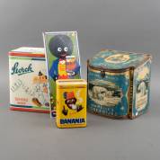 Drie metalen voorraadblikken: 'Storck Schoko Mint', 'Banania', en 'Van Melle's IJsbeertjes', daarbij: emaille reclamebord 'Robertson's Golden Shred' -gebruikssporen, blik van Melle met roestgaatjes-, reclamebord 36 × 16,5 cm