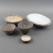 Rakugestookte keramiek schaal op drie pootjes, de binnenkant met lichtblauw craqueléglazuur, vier rakugestookte keramiek schalen, waarvan één uitvoering Kunstaardewerkfabriek Mobach, Utrecht, grote schaal 8 × 32 × 24 cm