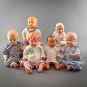 Zes kunststof poppen, kleding niet origineel -de jongenspop heeft een barst in het hoofd, speelsporen-, 60 cm