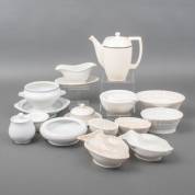 Verzameling van zes puddingvormen en divers wit aardwerk, diverse makers, waaronder: koffiepot met bruine band met niet bijbehorende deksel, vijzel met stamper, en sauskom -enkele kleine defecten-, vijzel 7 × Ø 16 cm