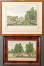 Twee deels ingekleurde opticaprenten: gezichten op de Maliebaan in Utrecht, beide Balthasar Friedrich Leizelt naar tekeningen van Justus Versteegh (ca.1734-1819), einde 18e eeuw -één prent gevlekt en waterschade in de rechtermarge-, 31 × 42 cm