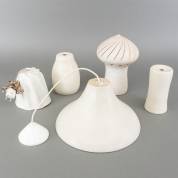 Drie crèmekleurige keramiek hanglampen en twee lampvoeten, uitvoering Kunstaardewerkfabriek Mobach, Utrecht -oude bedrading-, grootste hanglamp Ø 33 cm