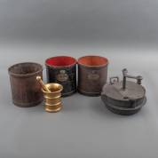 Drie ijzeren graanmaten, messing vijzel, en gietijzeren koffiebrandmolen -gebruikssporen-, 25 × 28 × 26 cm, herkomst: Kruideniersmuseum Utrecht