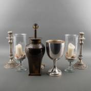 Divers kleingoed: messing lampvoet, verzilverde kelk, paar windlichten en paar verzilverde kandelaars, windlichten 45 × Ø 17 cm