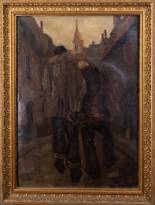 Hollandse School: twee figuren in een straat, op de rug gezien, ongesigneerd, verso: landschap met figuren in bootjes bij een bruggetje, onduidelijke gemonogrammeerd, beide olieverf op doek, 74,5 × 54 cm