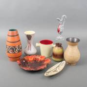Acht aardewerk vazen en schalen, waaronder uitvoering Scheurich, West-Germany, derde kwart 20e eeuw -chip van schuitvormig schaaltje-, hoogste 26 cm