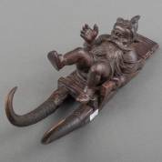 Gestoken houten wandkapstokje in de vorm van een boskabouter met hakbijl, met twee hoornen haken, Schwarzwald, 19e eeuw, 26 × 9 × 9 cm