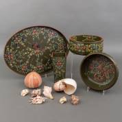 Enkele beschilderde houten schalen en dienblad, daarbij: nautilusschelp, zee-egelpantser en enkele andere schelpen