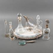 Divers glazen karaffen met zilveren en verzilverde monturen, loep en flesopener, samen op dienblad
