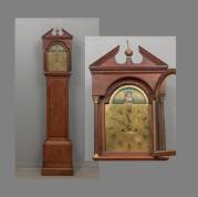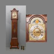 Staand horloge in notengefineerde kast, de messing wijzerplaat met maanaanduiding, vier opengewerkte hoekstukken, verzilverde cijferring, en twee bellen, inclusief slinger en twee gewichten, adres: Daniel Ferrin, Amstelredam, 20e eeuw -deurtje met ruit, zijschermen en poppen ontbreken-, 236 × 55 × 26 cm