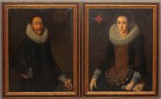 Hollandse School: replica's van vroeg 17e-eeuwse huwelijksportretten, olieverf op doek, niet gesigneerd, 20e eeuw -enkele beschadigingen en restauraties-, 104 × 81 cm per stuk