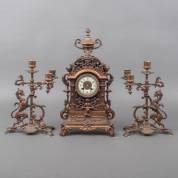 Messing klokkenstel met rijk opengewerkt decor, circa 1900, 47 × 24 × 14 cm