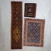Drie tapijtjes: Turkmeense pendjerelik Beshir, 36 × 164 cm, en twee Perzische tapijtjes Belouche -één sleets-
