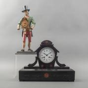 Composiet polychroom beschilderd klokkenmannetje, Duitsland, 20e eeuw -geen gewichten, grote wijzer afgebroken-, 41 cm hoog, en pendule in zwart marmeren kast -gelijmd-, 32 × 42 × 14 cm