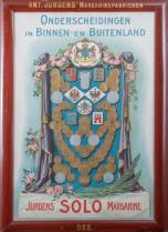 Reclameposter: 'Onderscheidingen in binnen- en buitenland Jurgens Solo margarine', in kleur, goud- en zilver gedrukt, in oorspronkelijke lijst met opschrift: 'Ant Jurgens' Margarinefabrieken Oss, 1905 -lijst met beschadigingen, poster wat verbogen-, 90 × 61 cm, herkomst: Kruideniersmuseum Utrecht