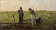Schilderij: kopie van het angelus van Jean-François Millet, olieverf op triplex, niet gesigneerd, 20e eeuw, 35,5 × 66 cm