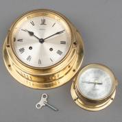 Messing scheepsklok, adres: Observer, en messing scheepsbarometer, Adres: Vetus, beide tweede helft 20e eeuw Ø 22,3 cm