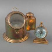 Scheepskompas in koperen behuizing, en bolvormig tafelklokje met op de achterzijde een kompas, afmetingen scheepskompas 20 × 22 × 18 cm