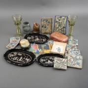 Divers kleingoed, waaronder: Perzische tegels, twee groenglazen knobbelglazen, drie dienbladen ingelegd met hout, etc.