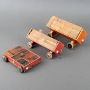 Drie houten blokkenwagens, allen gevuld met houten blokken, ADO, Berg & Bosch -bespeeld-, rode wagen 20 × 16 × 5 cm