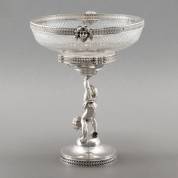 Pièce de milieu met kristallen schaal op losse 3e gehalte zilveren voet gevormd als cherubijn met guirlandes en opengewerkte banden, de schaal met zilveren montuur, meester: Gabriel Beunke, Frankrijk, 1910-1919, gewicht zilver 607 gram, 29 × Ø 22,5 cm