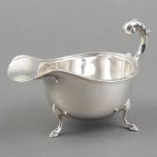 1e gehalte zilveren sauskom op vier hoefvormige pootjes en voluutvormige greep, Birmingham, 1932, gewicht 138 gram, 10 × 16,5 × 9 cm