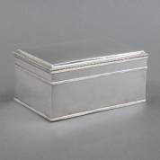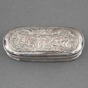 Rechthoekige zilveren koektrommel afgezet met parelrand, meester: Jacob Hendrik Stellingwerf, Amsterdam, 1810, tevens met herkeur Zuidelijke Nederlanden, gewicht 543 gram, 7 × 15 × 10 cm