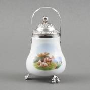 Porseleinen tondeldoos met polychrome decors en voorzien van 2e gehalte zilveren monturen en hengsel, 19e eeuw, hoogte 12 cm