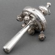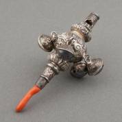 1e gehalte zilveren rammelaar met fluit, bloedkoralen tak en bellen, Birmingham, 1908, brutogewicht 26 gram, 9,5 cm
