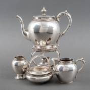 Vijfdelig 2e gehalte zilveren theeservies gedecoreerd met parelranden, bestaande uit: theepot, komfoor, suikermand, roomkan en lepelvaas, diverse uitvoeringen van Van Kempen, diverse jaren tussen 1922 en 1953, gewicht 1091 gram, theepot circa 16 × 21 × 13 cm -enkele gebruikssporen-