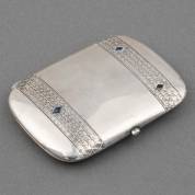 2e gehalte zilveren sigarettenkoker met ruitdecor en gezet met drie ruitgeslepen blauwe saffieren, brutogewicht 97 gram