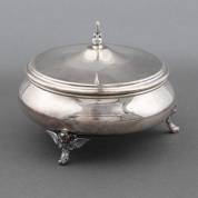 Rond 2e gehalte zilveren dekseldoosje op drie engelvormige pootjes, gewicht 271 gram, 9,5 × 12 cm