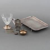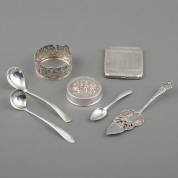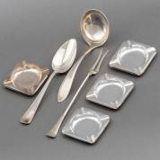 Vier 1e gehalte zilveren asbakjes, 2e gehalte zilveren sauslepel, vleesvork en dessertlepel, gewicht 219 gram, asbakjes 6,5 × 6,5 cm