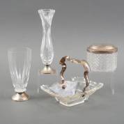 Kristallen prijsbeker op 2e gehalte zilveren voet, glazen vaasje op 2e gehalte zilveren voet, kristallen hengselmandje met 2e gehalte zilveren hengsel en kristallen theebus met ruitslijpsel en 2e gehalte zilveren deksel met parelrand, gewicht zilver circa 100 gram, vaasje 21,5 cm -mandje met chips-