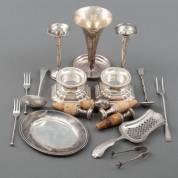 Divers zilverwerk, diverse gehaltes, waaronder sauslepel, ovaal schaaltje, twee anjervaasjes en paar lage gegraveerde tafelkandelaars, gewicht zilver minimaal 400 gram