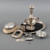 Divers zilverwerk, diverse gehaltes, waaronder: vermaakte kandelaar, à double usage, tafelborstel met 2e gehalte zilveren kap, fotolijstje en twee flessenlabels, gewicht zilver minimaal 250 gram, dienblaadje 25 × 18 cm