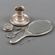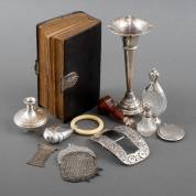 Divers klein zilverwerk: lorgnet in 1e gehalte zilveren montuur, 2e gehalte zilveren pepermuntdoosje met filigrain deksel, handspiegel in 1e gehalte zilveren montuur, 2e gehalte zilveren houder en 2e gehalte filigrain broche, daarbij: gebroken cocktailvorkje, brutogewicht 492 gram, spiegel 27 cm -deukjes en gebruikssporen-