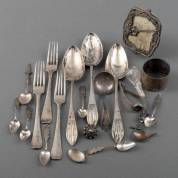 Divers zilverwerk, diverse gehaltes, waaronder: fotolijst gemaakt van tasbeugel, 2e gehalte zilveren damespolshorloge, drie lepels, drie vorken en zes 2e gehalte zilveren kwastlepeltjes, gewicht zilver circa 400 gram