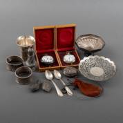 Divers klein zilverwerk, diverse gehaltes, waaronder: strooier, beker met inscriptie, opengewerkt schaaltje en twee zakhorloges, gewicht zilver 465 gram, beker 7,5 × Ø 7 cm