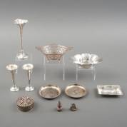 Divers zilverwerk, diverse gehaltes, waaronder twee muntschaaltjes en een gehamerd 2e gehalte zilveren bonbonmandje, gewicht 373 gram -schaaltjes op onderzijde met ingekraste code, twee vaasje verbogen-