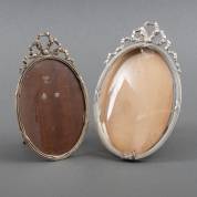 Twee ovale 2e gehalte zilveren fotolijsten met kruis- en strikdecor, houten achterzijde en standaard, de grootste met bol kunststof voorplaat, de kleinste met glazen voorplaat, fotomaat 16,5 × 12 en 14 × 10,5 cm -defecten-