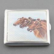 2e gehalte zilveren sigarettendoos met op de voorzijde een geëmailleerde voorstelling: drie racepaardenhoofden -emaille met kleine beschadiging-, de achterzijde met drie gouden appliques, Rusland, begin 20e eeuw, brutogewicht 174,2 gram