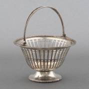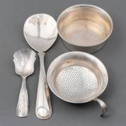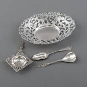 Vier stuks klein zilverwerk: bonbonmandje met opengewerkte rand, suikerschepje, theeschepje en theezeefje, alle 20e eeuw, bonbonmandje 2e gehalte, gewicht 167 gram, bonbonmand 3 × 18,5 × 13,5 cm