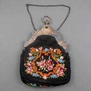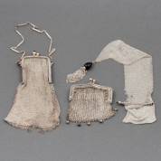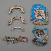 2e gehalte zilveren tasbeugel, meesterteken onduidelijk, Hollands, 1851, en twee BWZG tasbeugels, daarbij delen van kralentasjes, gewicht zilver 79 gram, grootste 10 × 4 cm