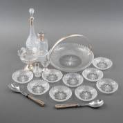 Kristallen schaal met 2e gehalte zilveren hengsel en negen kristallen schaaltjes, alle met puntslijpsel maar geen set -kleine schaaltjes hebben chips van de randen, grote schaal is gaaf-, schaal Ø 27 cm, kristallen coupe, en glaasje op 2e gehalte zilveren voet, kristallen karaf, flacon, zoutstrooier met 2e gehalte zilveren monturen of dop, en slabestek met 2e gehalte zilveren heften -zoutstrooier heeft kleine chip aan de voet-, hoogte karaf 26 cm