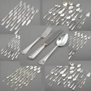 Negenpersoons 1e gehalte zilveren bestek, (999/1000), Haags lof, bestaande uit: dinercouverts, dinermessen, dessertcouverts, dessertmessen, viscouverts, theelepels, taartvorkjes, mokkalepels en 25-delig diencouvert, meester: M.J. Gerritsen, Zeist, circa 1970, gewicht zonder messen, aansnij- en komkommercouvert 5946 gram, brutogewicht messen, aansnij- en komkommercouvert 2479 gram -één dinermes en mokkalepel ontbreken-