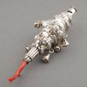 1e gehalte zilveren rammelaar met fluit, bloedkoralen takje en bellen, Birmingham, 1902, brutogewicht 73 gram, 16 cm