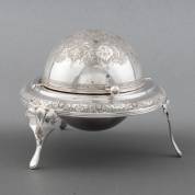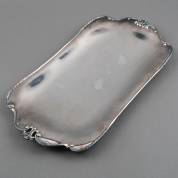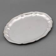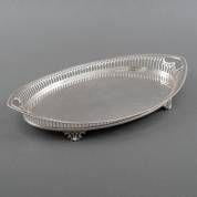 Spitsovaal 2e gehalte zilveren cabaret met opstaande galerierand, twee hartvormige greepjes en afgezet met parelrand, staand op vier gedecoreerde pootjes, meester: J.M. van Kempen & Zonen, Voorschoten, 1911, gewicht 558 gram, 5 × 36 × 21 cm
