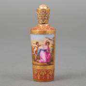 Beschilderde porseleinen parfumflacon met 14kt gouden montuur en dop met opgelegd draaddecor, zilveren binnenstopje aanwezig, 19e eeuw, 9 cm