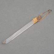 Langwerpig gekant kristallen parfumflacon met 14kt gouden dop met draagkettinkje, de dop gezet met cabochongeslepen saffiertje, 13 cm